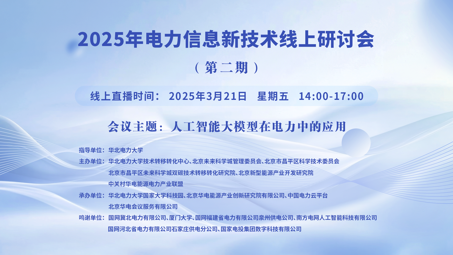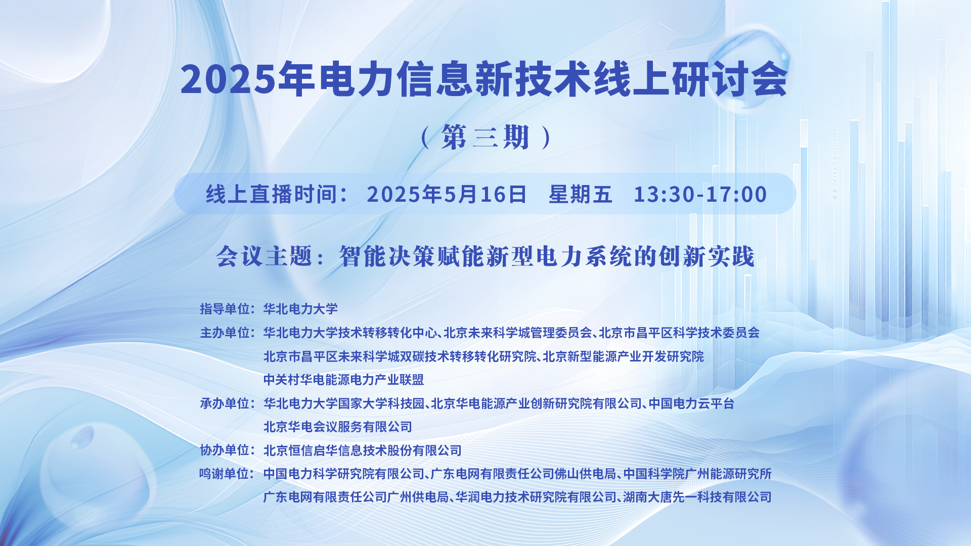 2025年電力信息新技術(shù)線上研討會(huì)(第三期)一、講座主題:智能決策賦能新型電力系統(tǒng)的創(chuàng)新實(shí)踐 二、講座時(shí)間:2025年5月16日 星期五 13:30-17:00 三、講座地點(diǎn):線上直播:https://t19c5.xetlk.com/sl/1KZA7r(聯(lián)系人李老師 18911662193) 四、主講人信息: (一)主講人:李亞平 ...主講人:李亞平、齊丹、邱桂華、王同賀、孔令明、彭喆、馬桂英時(shí)間:2025-05-16 13:30地點(diǎn):線上講座 -